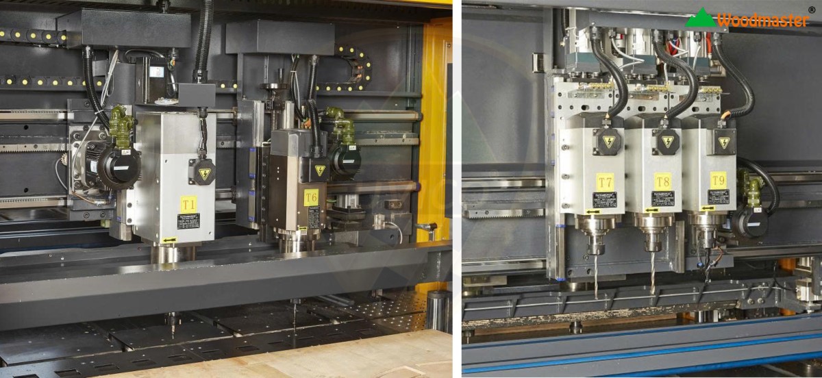 Sử dụng 3 trục điện có thể nâng lên độc lập nên có thể khoan các lỗ có 3 đường kính khác nhau. Chỉ mất 2 giây để khoan các lỗ khác nhau, tiết kiệm thời gian thay dao cụ.